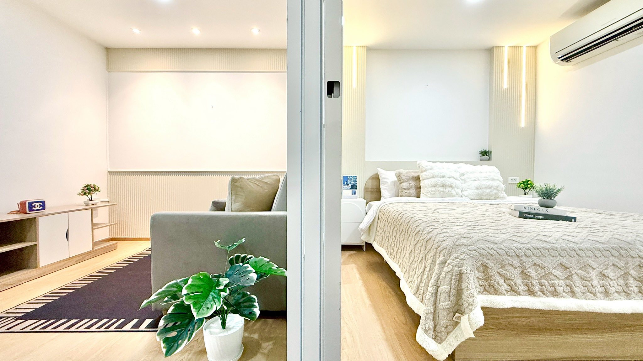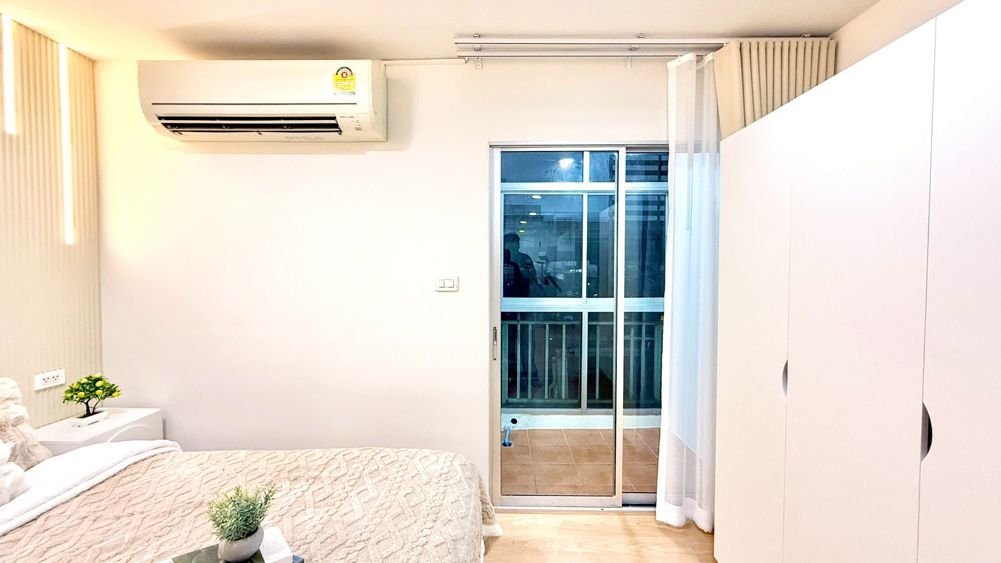 แอร์ใหม่, เตียง 5 ฟุต + ฟูก, ตู้เสื้อผ้า, โซฟา, โต๊ะกลาง, Digital Door Lock และ Key Card เข้า-ออกอาคาร