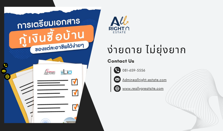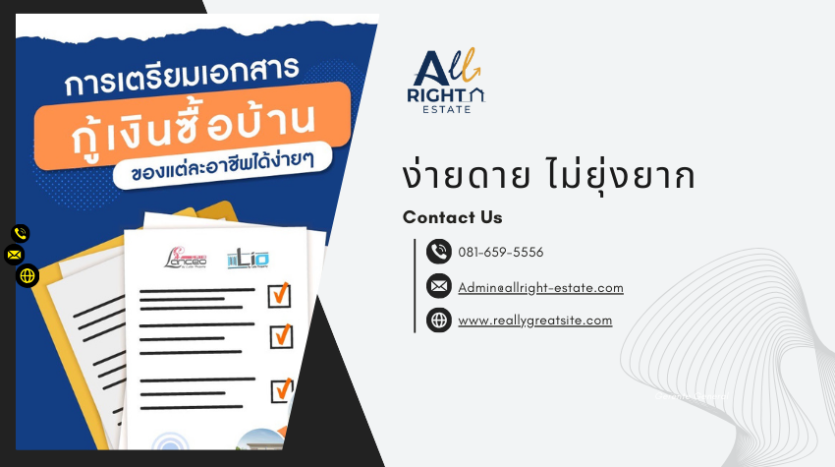 หากคุณกำลังมองหา คอนโด กรุงเทพ หรือบ้านทำเลศักยภาพ การเตรียมเอกสารกู้ซื้อให้ครบถ้วนตั้งแต่แรก จะช่วยเพิ่มโอกาสอนุมัติเร็ว และได้วงเงินสูงขึ้น All Right Estate รวบรวมรายการเอกสารสำคัญที่ผู้ซื้อบ้านและคอนโดในกรุงเทพต้องเตรียมไว้ให้ครบในที่เดียว